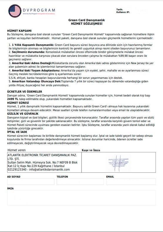 Sizin için özel olarak hazırlanmış Green Card Danışmanlığı kapsamında sağlanan hizmetlere ilişkin şartları ve koşulları belirtmektedir.
